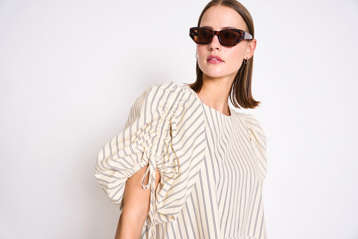 Näyttävät puhvihihat: Kyynärpäämittaiset hihat, joissa on rypytetyt kiristysnauhat ja joustavat hihansuut tuomassa runsasta muotoa.