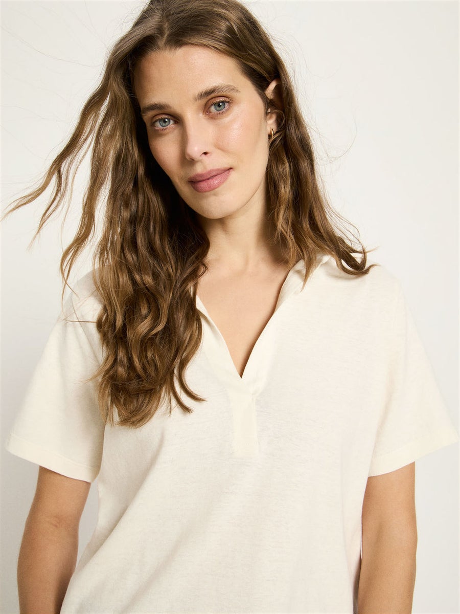 Tämä hampusta ja luomupuuvillasta valmistettu paita huokuu kesäistä keveyttä ja selkeälinjaisuutta. Avoin polokaulus tuo paitaan klassista ilmettä ilman, että se vaikuttaa liian muodolliselta – täydellinen valinta rentoihin, mutta huoliteltuihin tyyleihin. Teksturoitu ja hengittävä kangas tuntuu iholla miellyttävältä ja pitää olon raikkaana myös lämpiminä päivinä. Modernin leikkauksensa ansiosta paitaa on helppo yhdistellä: kokeile farkkujen ja suorien housujen kanssa tai luo mielenkiintoinen kontrasti kauniisti laskeutuvien hameiden parina.